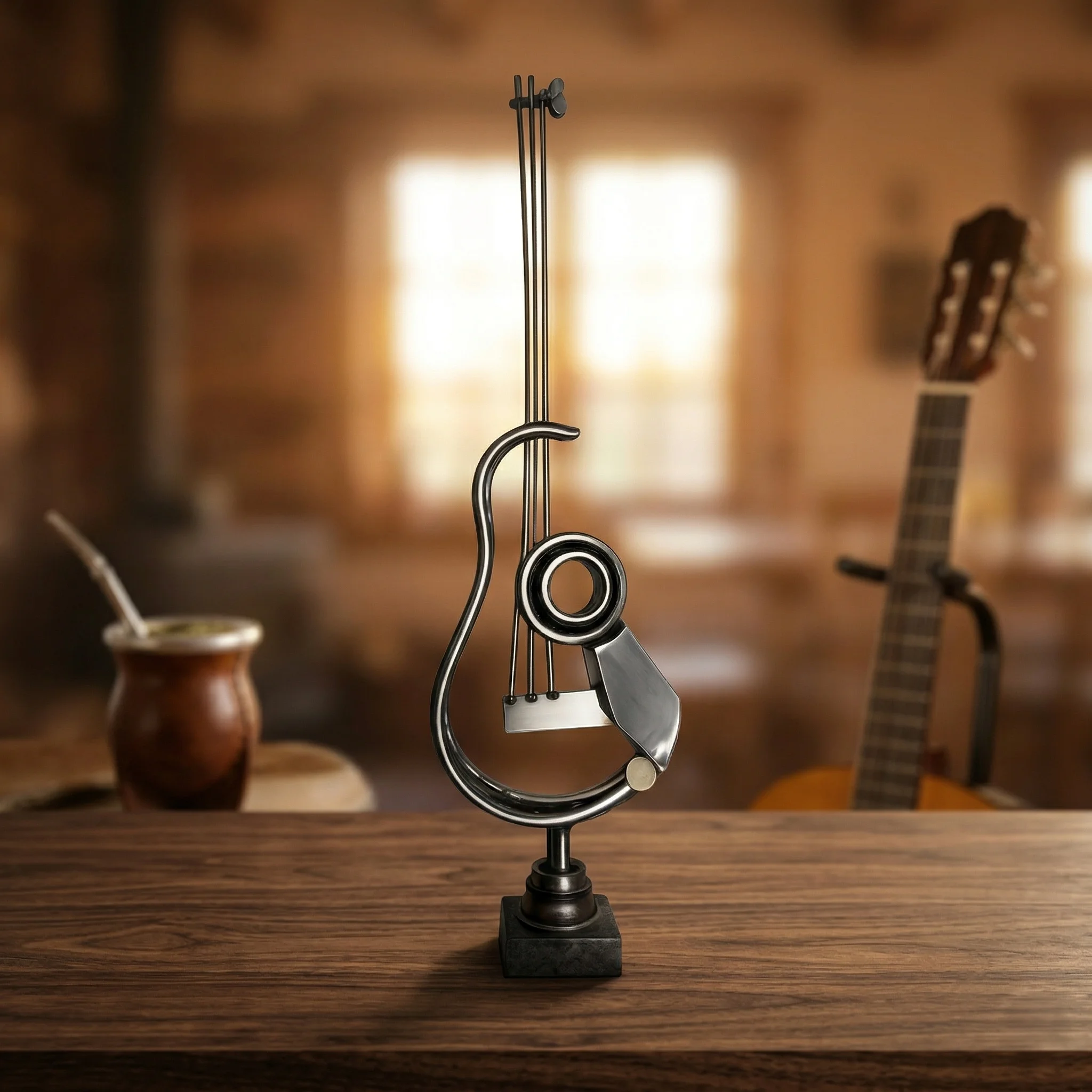 Una réplica del imponente monumento que nos recibe en el acceso de ingreso a Puerto Tirol va para Casa Sole: las manos de Kike Yorg (escultor, muralista, docente y mucho más) modelaron una guitarra sin tiempo. Nos invita a completar melodías, a no olvidarnos de esta tierra próspera de Puerto Tirol que ha recibido a muchos migrantes que venían por trabajo y echaron raíces. Kike se define como un “obrero del arte” (en una entrevista realizada por Samanta Matzke) y embellece su pago chico, dejando mensajes en murales y moldeando hierros.